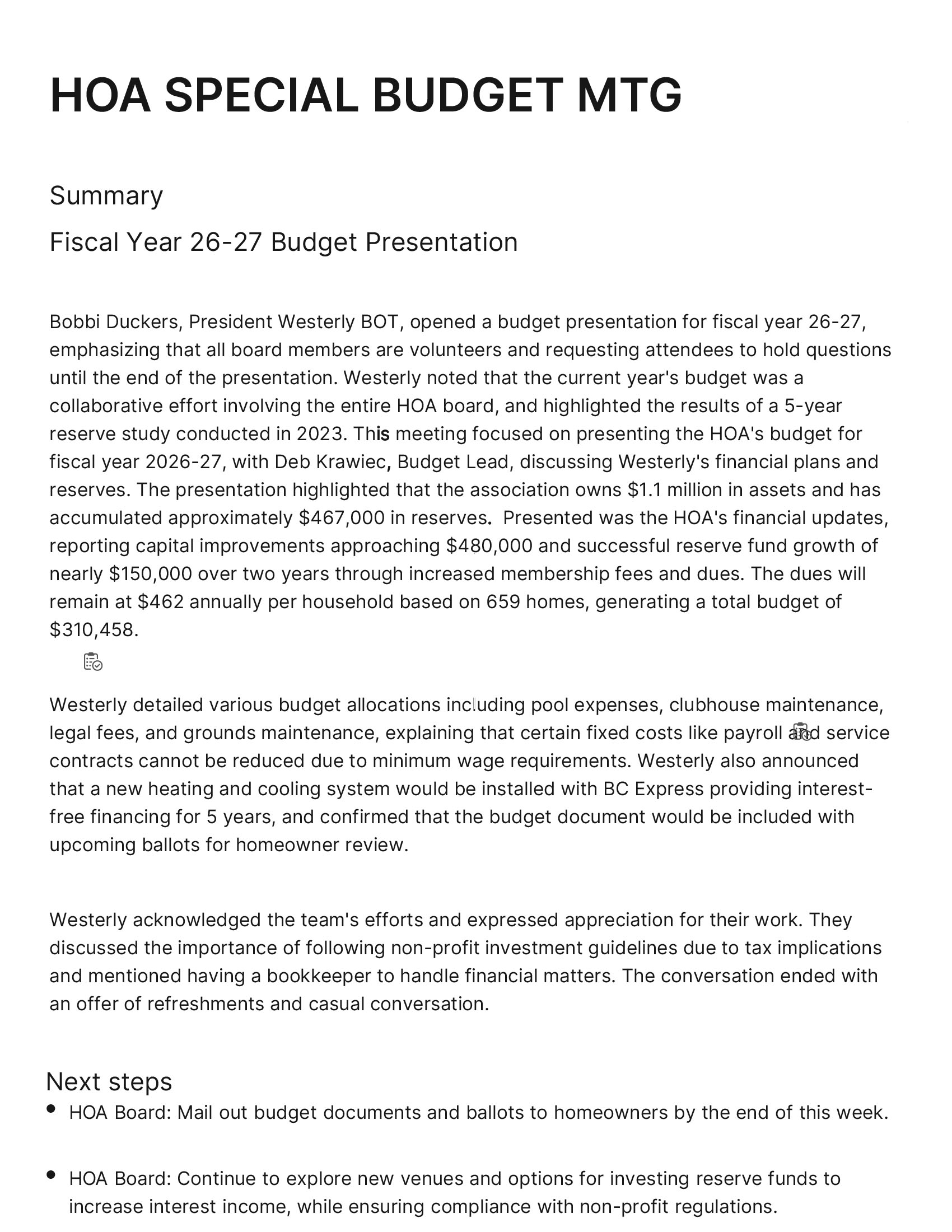 Westerly HOA 2026-2027 Budget Presentation